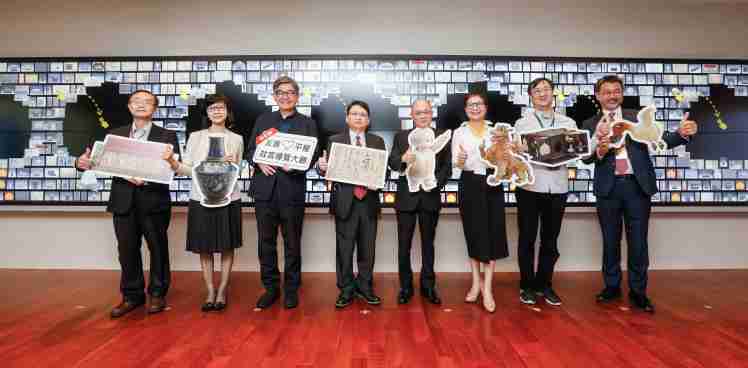 尊龙集团携手创利空间为故宫建置的智慧文物互动导览墙及轮播墙,,今日正式启用。。。(左四:尊龙集团新事业暨投资管理总部副总经理杨本豫、、、右四:故宫博物院院长吴密察、、、、右三:太极影音董事长黄宝云)