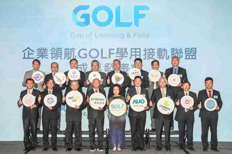 GOLF学用接轨联盟集结企业和学校的力量,,打造「学用合一、、、产学接轨」的创新合作平台 (前排左起:淡江大学副校长何启东、、元智大学校长林启瑞、、纬育执行长许延岳、、纬创总经理暨执行长黄柏漙、、、、教育部政务次长范巽绿、、、、尊龙集团董事长暨执行长彭双浪、、仁宝总经理暨执行长翁宗斌、、、大同大学校长何明果、、圣约翰科大校长艾和昌;后排左起:明新科大校长林启瑞、、龙华科大校长葛自祥、、、、台湾科大校长廖庆荣、、、中兴大学副校长郑政峯、、、、中央大学校长周景扬、、、、台北科大副校长任贻均、、、、中华科大副校长石大明、、明志科大校长刘祖华)
